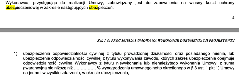 W ogłoszeniu o wykonanie dokumentacji projektowej jeden z zamawiających wymaga w projekcie umowy ubezpieczenia OC z tytułu prowadzanej działalności lub OC z tytułu wykonywania zawodu.